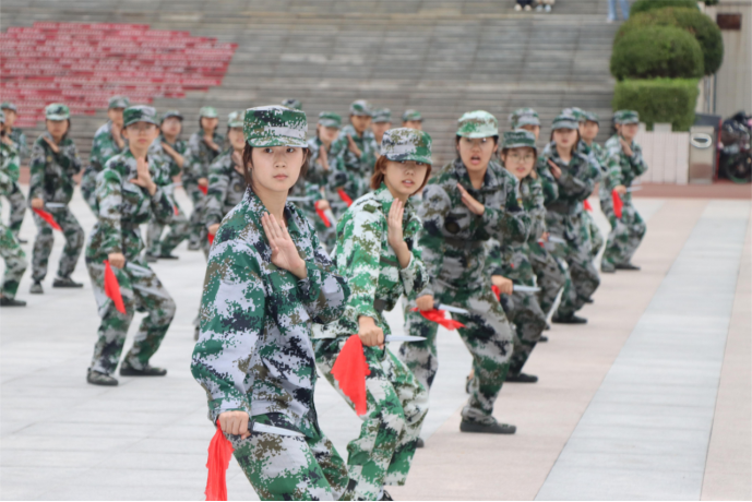 2023级新生身着整齐的迷彩服,军容严整,士气高昂,全面彰显出沧州师院学子英姿飒爽、意气风发的精气神。