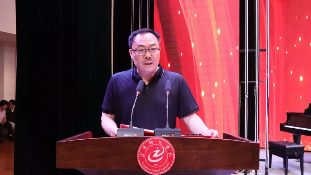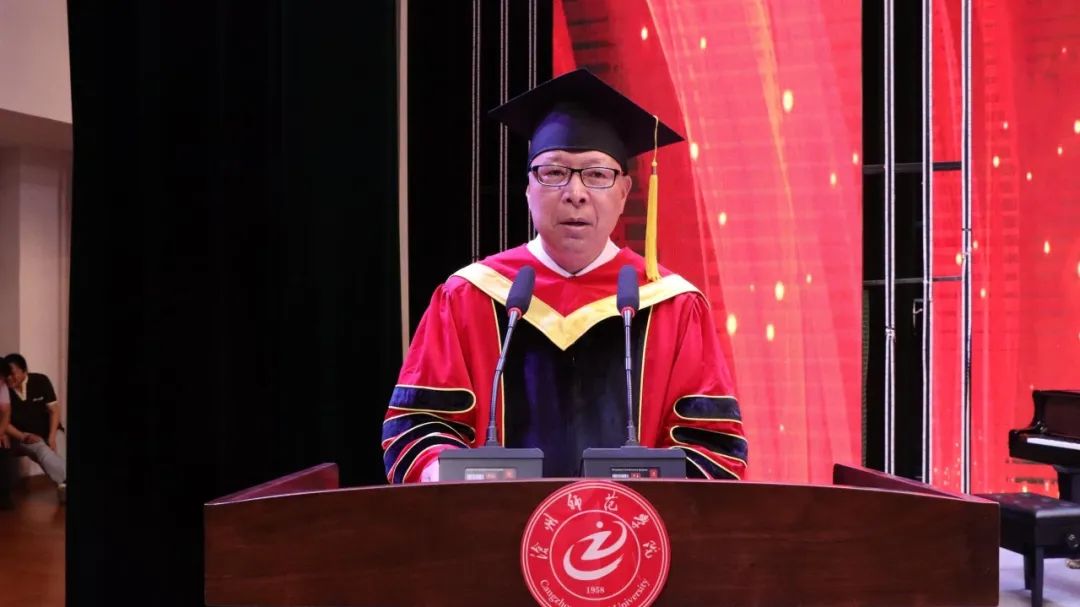 化学与化工学院毕业生马彬智父亲马强作为家长代表发言:“愿大家把个人理想融入党和国家的事业当中,为党、为祖国、为人民多作贡献,展现师院人独有的风采。”