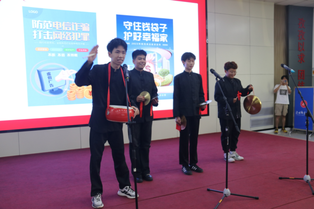 仪式上,同学们通过快板、朗诵、案例分享、三句半、舞蹈、情景剧、歌曲等节目形式进行了防诈骗文艺节目演出。数学与统计学院、美术学院、安全工作处、学生工作处、校团委主要负责人及相关人员出席,数学与统计学院和美术学院300余名师生参加活动。